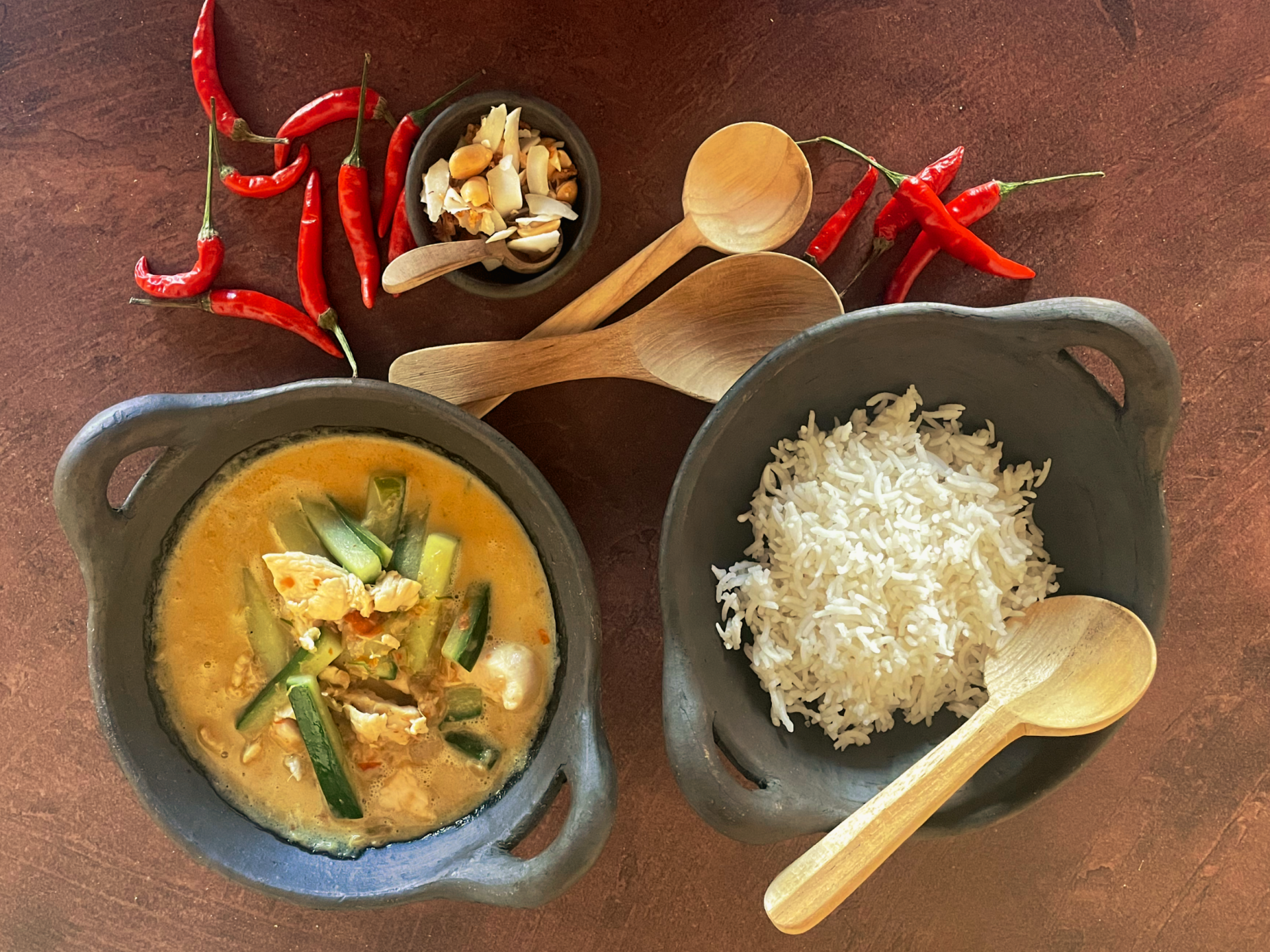Mijn bescheiden versie van de uiterst gelaagde curry van Dylan Jones staat hier: Stix' Rode Curry met kip en komkommer. De currypasta van Stix & Curry zit boordevol rode pepers, maar is desondanks erg mild. Ik snijd daarom altijd nog een rode peper in dunne schijfjes en zet deze naast de curry op tafel. Het pittige van de rode peper is superlekker samen met de frisheid van de komkommer en de cashewnoten en zuring maken het helemaal af.